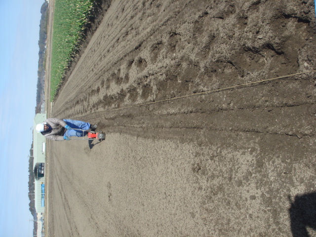 普通はトレイに種蒔いてハウスで育苗しますが、大苗は畑で苗を多きく育てて(細ネギ程度に)