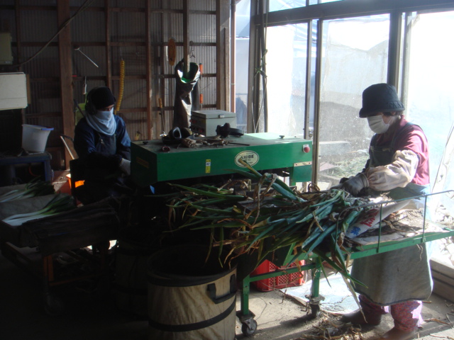 家についたらネギを作業場にフォークリフトで降ろして、皮むきの開始です。